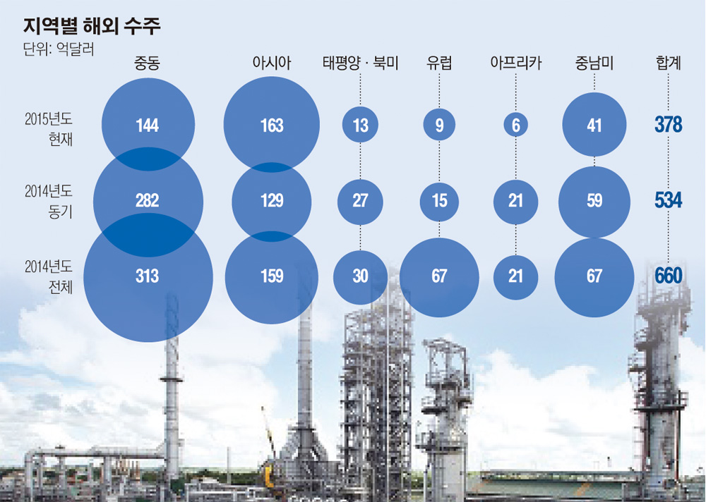 올해 현재(11월12일)까지 중동에서의 수주액은 144억 달러로 지난해같은 기간(282억 달러)과 비교해 거의 반토막이 났다. 주력인 석유 및 가스 분야가 각각 45%, 39% 감소해 저유가에 따른 출혈이 심했다.