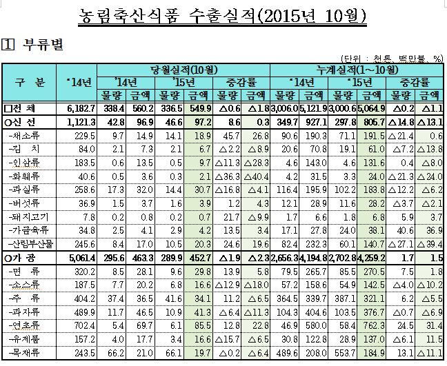 10월 한달간 농식품 수출액도 5억5000만 달러로 전년동월(5억6000만 달러)보다 1.8% 줄었다.