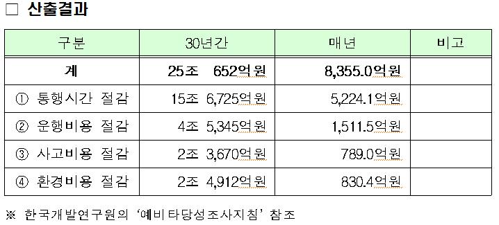 이에 대해 국토부 관계자는 "사회적 편익효과를 30년간 추산할 경우 총 25조652억원의 비용이 절감되는 효과를 가져올 수 있다"고 분석했다.