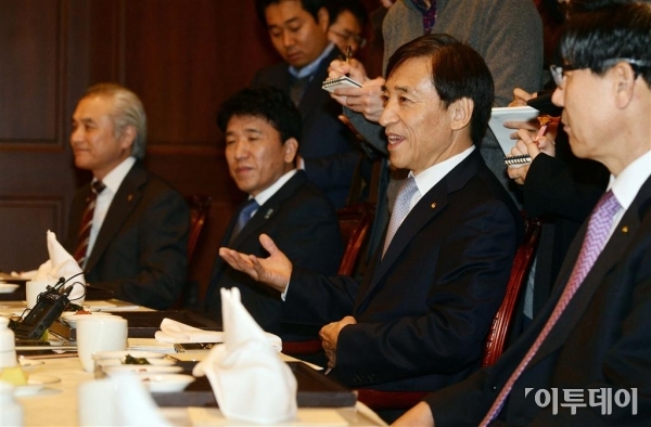 이주열 한국은행 총재가 20일 서울 남대문로 한국은행에서 열린 금융협의회에 참석해 모두발언을 하고 있다. 이 총재는 이 자리에서 “최근 글로벌 경제에 영향을 줄 수 있는 사건으로 파리에서 발생한 테러를 들 수 있다”며 “다만 우리 경제는 기초여건이 견실한 데다 정책대응 여력도 갖추고 있어 아직은 크게 우려할 상황은 아니다”라고 말했다. 신태현 기자 holjjak@