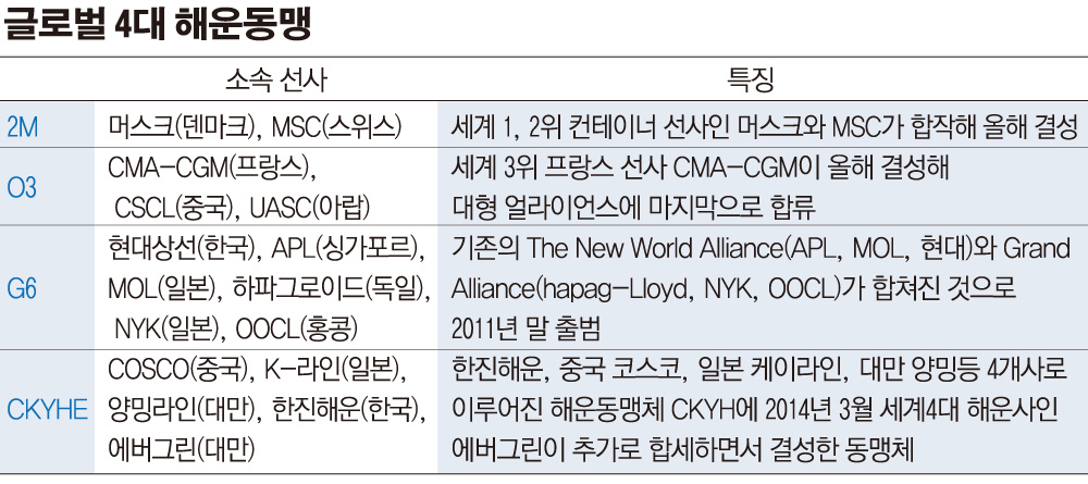 한진해운ㆍ현대상선 등이 속한 글로벌 해운동맹(얼라이언스)에 대한 회의론이 급부상하고 있습니다. 몸집만 커진 상황에서 독과점 체제만 유지된 채 기존 결성 목적과 반하는 비효율적인 상황이 끊임없이 발생한다는 이유입니다. 영국 해운전문지 로이즈리스트는 25일(현지시간) 해운동맹에 참여하고 있는 컨테이너 선사들이 ‘해운동맹의 비효율성’에 대한 문제를 제기했습니다.