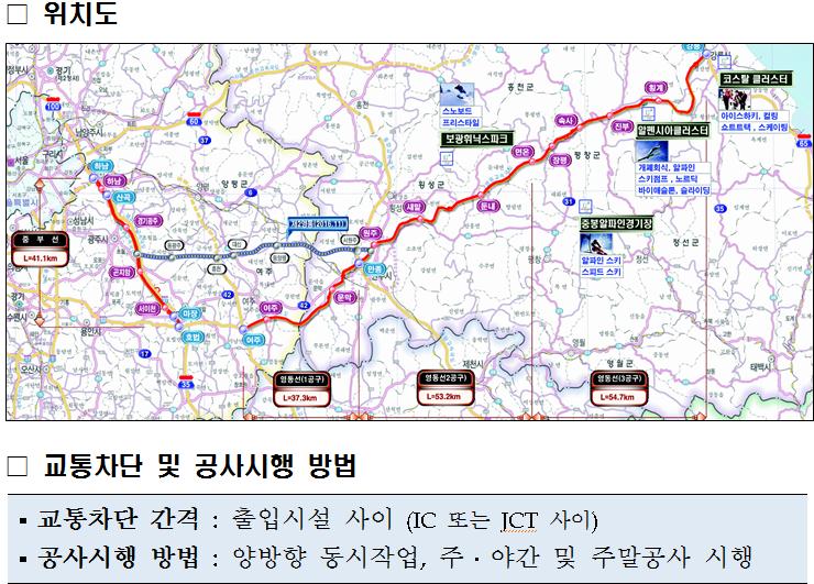 이번 사업으로 중부선, 영동선 사업구간 내 노후 포장, 구조물(교량 278개소, 터널 31개소), 가드레일 등의 안전시설이 전면 개선된다.