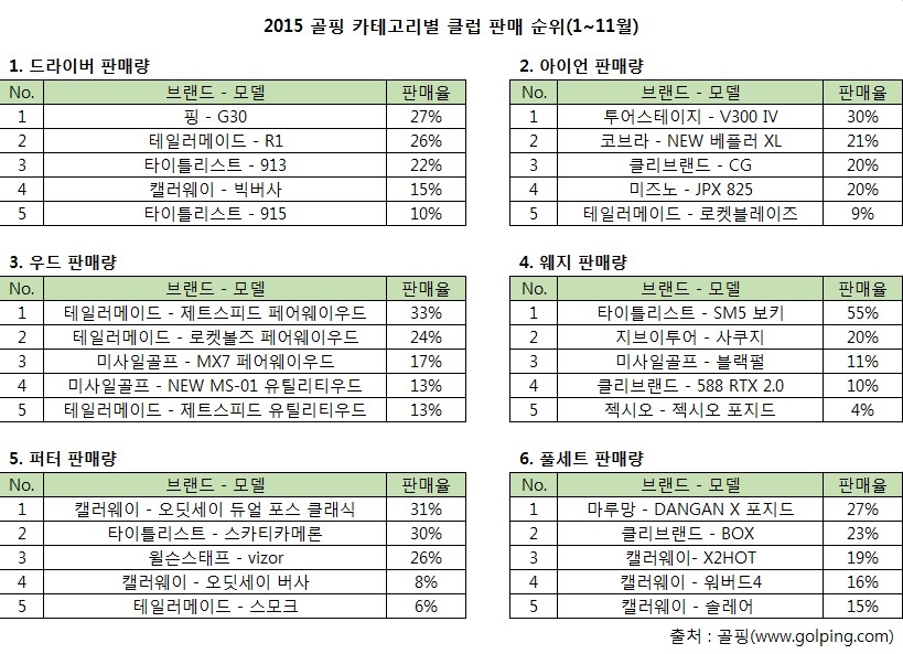 드라이버 판매량 1위는 핑 G30(27%)이 차지했다. 2위는 테일러메이드 R1(26%), 3위는 타이틀리스트 913 모델(22%)로 집계됐다. 특히 이들 클럽 판매량은 순위권 드라이버 판매량의 75%에 이를 정도로 인기를 실감했다.