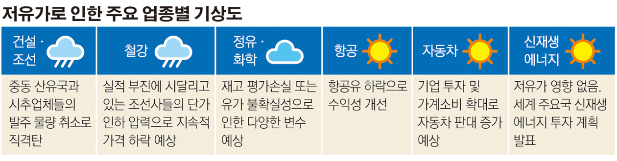 국제 유가가 배럴당 30달러 아래로 떨어지고 장기적으로 20달러대까지 내려갈 수 있다는 전망에 산업별 희비가 엇갈리고 있다. 항공과 해운, 자동차 등 일부 업종은 유류비 절감과 소비 확대 기대감에 수익성 개선이 기대된다. 반면 시추업체들의 발주 물량 취소라는 직격탄을 맞은 조선과 건설 등은 수주 급감이 우려되고 있다.