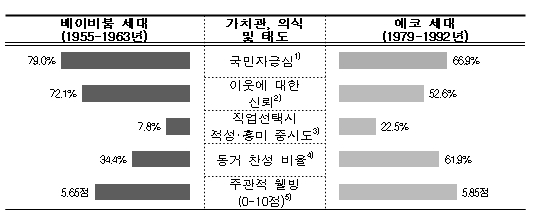 에코 세대는 베이비붐 세대에 비해 진보 성향은 두 배 이상 높고 보수 성향은 절반 이하였다. 대한민국 국민으로서의 자부심은 에코 세대(66.9%)에 비해 베이비붐 세대(79.0%)가 더 높았다.