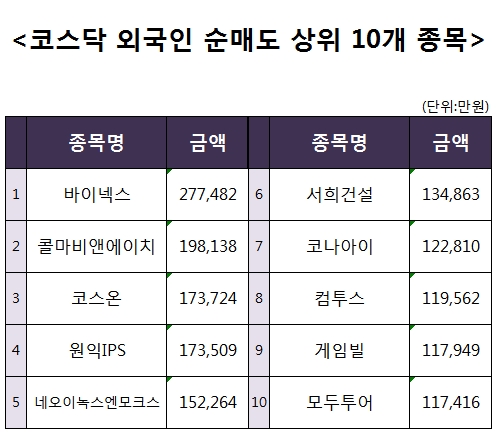 10일 코스닥 외국인 순매도 상위 10개 종목