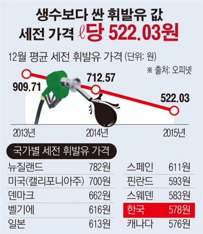 국내 주유소에서 판매되는 휘발유가 ℓ당 500원 수준으로 같은 양의 생수 가격보다 저렴한 것으로 나타났다. 하지만, 각종 세금이 붙어 최종 소비자 가격은 1400원이 넘었다.