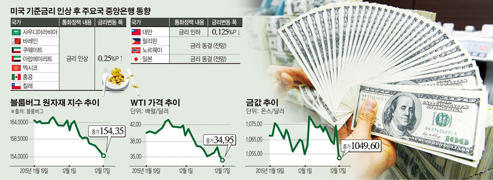 가장 먼저 대응에 나선 것은 사우디아라비아, 아랍에미리트(UAE), 쿠웨이트, 바레인 등 중동 4개국이다. 미국 금리인상 전부터 달러 강세에 몸살을 앓았던 이들 국가는 미국 연방준비제도(Fed.,연준)가 16일(현지시간) 금리인상을 단행하자 같은 날 바로 금리인상에 나섰다. 인상 폭도 연준과 같은 0.25%포인트였다. 모하마드 알 하살 쿠웨이트 중앙은행 총재는 “국가통화의 경쟁력을 지키고 국가 경제 지지를 위해 금리를 인상한다”고 밝혔다. 이들 4개국은 중동 6개 국가가 모인 걸프협력회의(GCC) 소속으로 쿠웨이트를 제외하고 미국 달러화에 자국 통화를 고정한 환율 페그제를 운용하고 있다는 특징이 있다. 이에 나머지 GCC 회원국인 오만과 카타르도 조만간 금리인상 대열에 합류할 것이란 전망이 지배적이다. 달러 페그제를 운용하는 이들 국가 통화 가치는 달러가 강세를 나타내면 상대적으로 하락하게 되고, 자금 이탈이 발생할 가능성이 높다. 이 때문에 미국 금리인상은 산유국 입장에서 반가운 소식은 아니다. 가뜩이나 걸프 산유국은 지난 1년 전만해도 배럴당 100달러대였던 유가가 공급 과잉 등으로 40달러 밑으로 추락하면서 재정수입이 크게 줄었다. 특히 그간의 미국 금리인상 전망이 달러 강세를 부추겨 유가 하방 압력을 키웠다는 평가다.