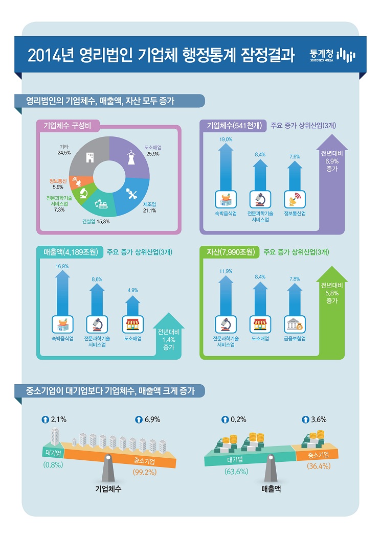 18일 통계청이 발표한 '2014년 영리법인 기업체 행정통계 잠정결과'에 따르면 지난해 영리법인 기업체수는 54만1000개로 전년에 비해 6.4% 증가한 것으로 나타났다. 이는 2013년 증감률(5.8%)에 비해 1.1%포인트 증가폭이 상승한 것이다. 매출액(4189조원)은 1.4%, 자산(7990조원)은 5.8% 늘었다.