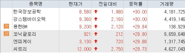 이밖에 한국정보공학(종가 8580원), 엔피케이(종가 3130원) 등도 상한가 명단에 이름을 올렸다.
