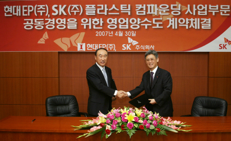 SK㈜ 화학사업부문장 김용흠 전무(오른쪽)와 현대EP 이건원 사장이 2일 오전 서울 서린동 SK㈜ 본사에서 계약을 체결한 후 악수하고 있다.