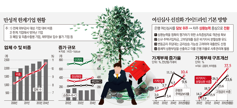 한국은행이 발표한 ‘2014년 기업경영분석’ 자료에 따르면 지난해 제조업 매출액 증가율은 마이너스(-) 1.6%를 기록했다. 제조업 매출이 감소한 것은 통계 작성이 시작된 1961년 이후 처음이다. 원·달러 환율과 원자재 가격 하락, 스마트폰 매출 감소가 원인으로 꼽힌다. 영업환경이 악화되니 영업이익으로 이자도 갚지 못해 빚으로 유지하는 한계기업도 크게 증가했다. 한은이 집계한 한계기업 수는 2009년 2698개였으나, 2014년 말 3295개로 급증했다.