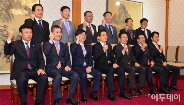 황교안 국무총리를 비롯한 내빈들이 23일 서울 삼청동 총리공관에서 열린 ‘일자리 창출 및 사회공헌 유공기업 간담회’에 참석해 기념촬영을 하고 있다. 이날 간담회는 어려운 여건 속에서도 일자리 창출과 고용 안정에 선도적 역할을 해온 일자리창출 유공기업인들을 격려하고, 일자리 창출에 대한 기업현장의 목소리를 듣기 위해 마련됐다. 신태현 기자 holjjak@