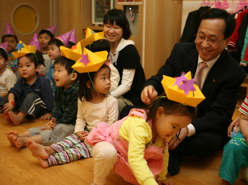 SK텔레콤 김신배 사장은 5월 가정의 달을 맞아 국내외의 직원 자녀 중 초등학생 자녀 2200여명에게 직접 작성한 편지와 문화상품권, 플래너 등 선물을 보냈다. 사진은 직원 자녀들에게 보낸 편지와 김신배 사장이 SK텔레콤 본사 임직원을 위한 탁아시설인 푸르니 어린이집을 방문해 아이들에게 선물을 나누어 주는 모습.