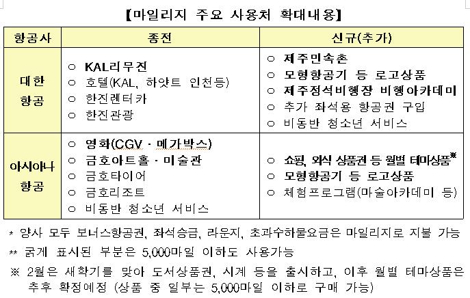 개선안에 따르면 마일리지 사용처가 항공권 외에 쇼핑, 외식, 제주민속촌 등이 추가된다. 기존 사용처는 영화 등 일부 제휴처를 제외하면 관광, 숙박 등에 집중돼 마일리지 사용을 원하는 소비자의 선택이 제한됐는데, 이번에 쇼핑, 외식, 체험프로그램, 항공 로고상품 등의 사용처를 추가해 소비자의 선택 폭을 넓혔다.
