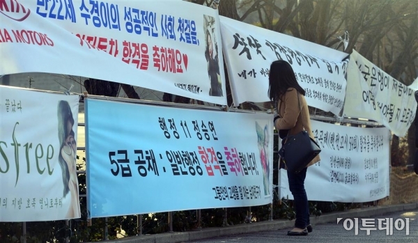 취업난에 졸업을 유예하는 대학생들이 늘고 있는 가운데 29일 서울 명륜동 성균관대에 하반기 취업 축하를 알리는 현수막들이 걸려 어려운 구직 현실을 실감케 하고 있다. 한편 교육부에 따르면 지난해 기준 졸업 유예 학생 수는 2만5246명으로, 138개 대학중 71%(98개교)가 졸업 유예제도를 실시 중이며 이는 2013년에 비해 8.3% 포인트 증가한 수치다. 신태현 기자 holjjak@