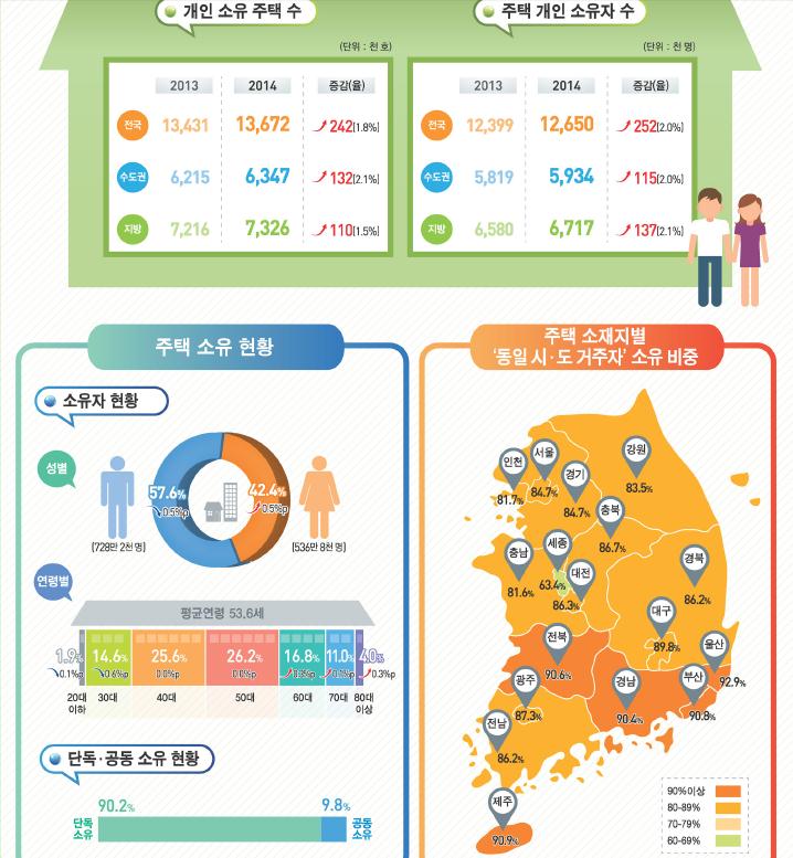 30일 통계청이 발표한 '2014년 개인별 주택소유 통계'에 따르면 2014년 11월 1일 현재 개인 소유주택은 1367만2000호로 전년에 비해 24만2000호가 증가했다. 이는 전년에 비해 1.8% 늘어난 수치다.