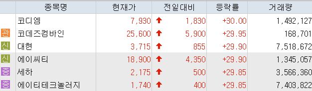 이 밖에 코데즈컴바인이 전 거래일 대비 29.95%(5900원) 오른 2만5600원에, 에이티테크놀러지가 전 거래일 대비 29.85%(400원) 오른 1740원에 거래를 마치며 상한가를 기록했다.