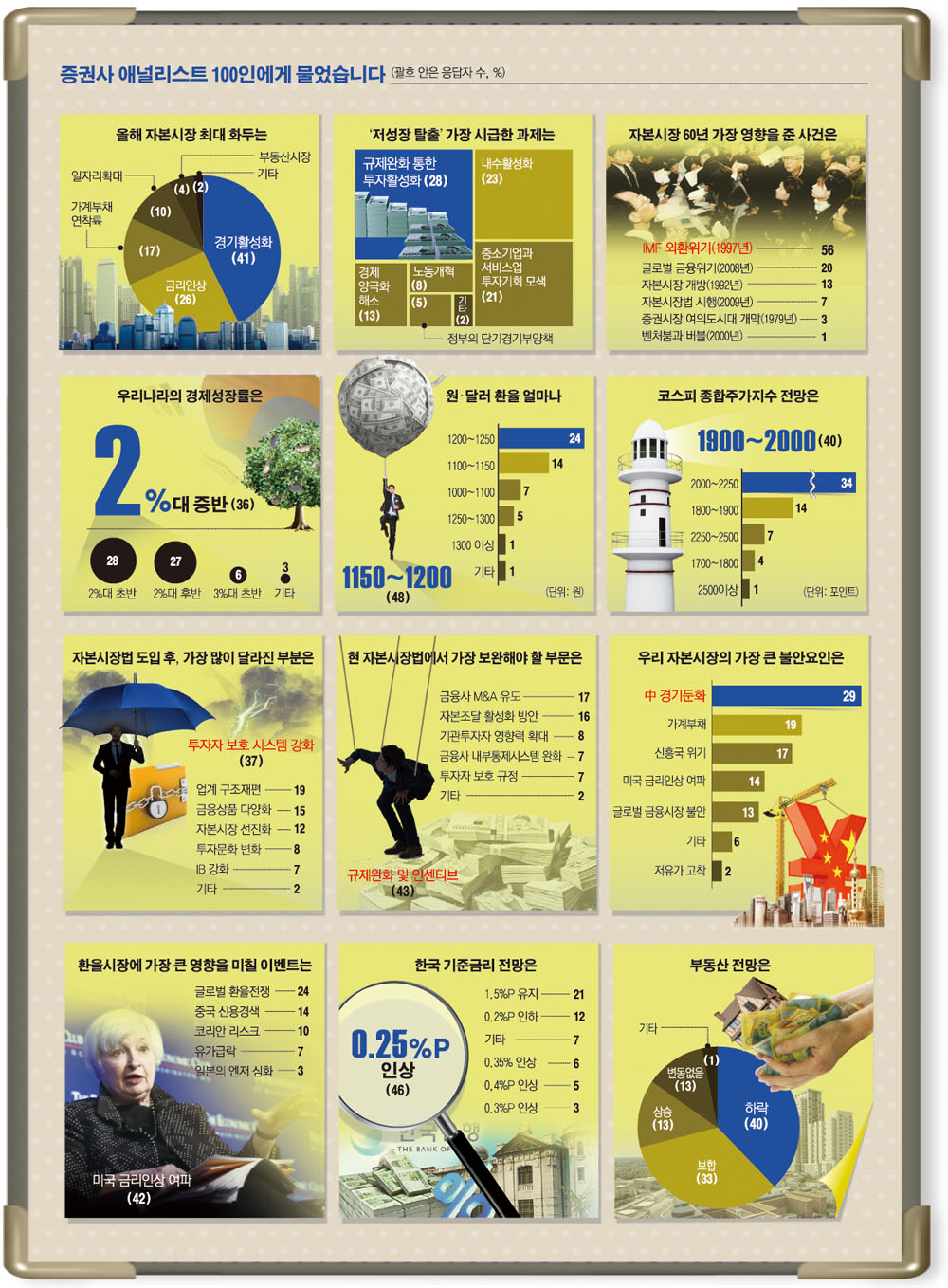 이 같은 저성장을 탈피하기 위한 시급한 과제로 증시 전문가의 28%가 ‘규제완화를 통한 투자활성화’를 꼽았다. 이어 ‘내수 활성화’(23%), ‘중소기업과 서비스업 투자기회 모색’(21%), ‘경제 양극화 해소’(13%) 순으로 답변했다.