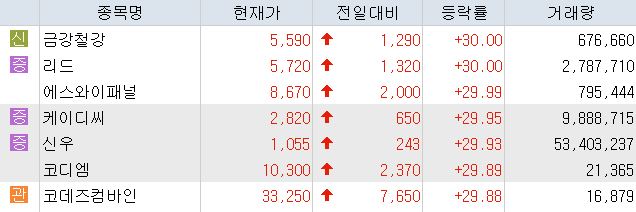 이 밖에 금강철강(종가 5590원), 리드(종가 5720원), 에스와이패널(종가 8670원), 케이디씨(종가 2820원) 등이 상한가 명단에 이름을 올렸다.