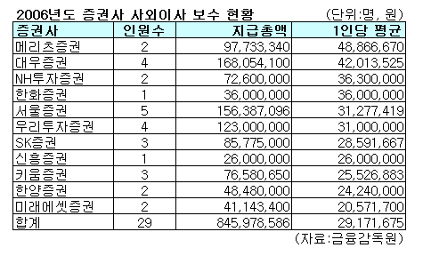 10일 금융감독원에 따르면 22개 상장 증권사 가운데 2006사업연도(2006년 4월~2007년 3월) 사외이사 보수 내역을 공시한 곳은 11개사에 이른다.