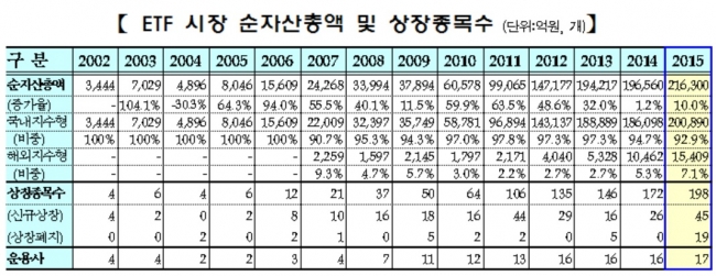 ETF 상장 종목수는 지난해 연간 45개 종목이 신규 상장된 데 따라 총 198개로 늘어났다. 이는 아시아 증시에서는 최대 규모다. ETF시장의 일평균 거래대금은 6961억원으로 전년(6883억원) 대비 1.1% 증가했다. 연간 누적거래대금은 1400억달러(한화 167조7900억원)로 세계 8위였다.