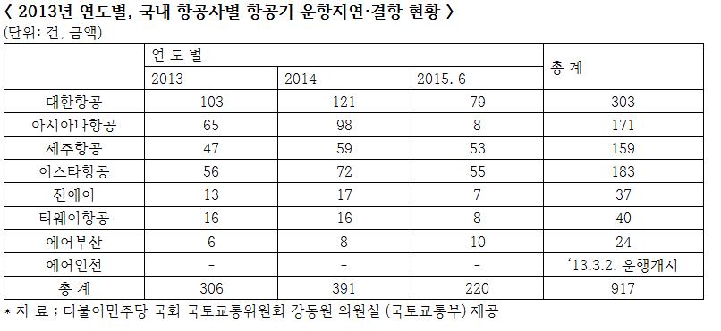 연도별로는 2013년 306건, 2014년 391건, 2015년 6월까지 220건으로 나타났다. 운항지연 및 결항사태를 항공사별는 대한항공이 가장 많은 303차례가 발생해 1위를 기록했다. 그 뒤를 이어 대형항공사인 아시아나항공을 제치고 저비용항공사인 이스타항공이 183차례나 발생해 2위를 차지했다. 한편 아시아나항공은 171건, 3위를 기록했다.