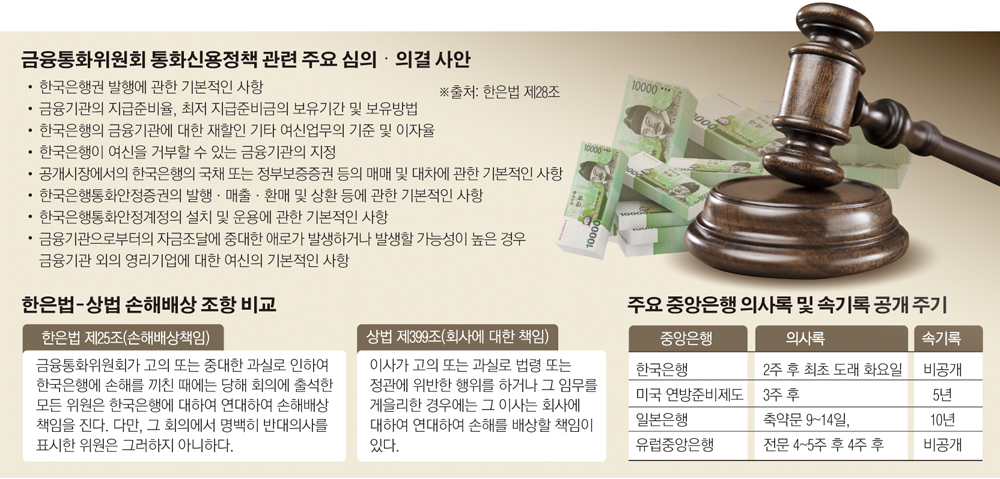 이에 전문가들은 금통위 손해배상 조항은 삭제하고 금통위의 책임성을 강화하기 위해 실명이 기재되는 속기록을 공개해야 한다고 제언했다. 금통위원 임기 중이 아니더라도 일정 기간이 지난 후에 속기록을 공개한다는 원칙이 생기면 금통위가 더욱 신중해질 것이란 주장이다. 미 연방준비제도(Fed·연준)와 일본은행(BOJ)은 각각 5년, 10년 주기로 통화정책 결정에 대한 속기록을 공개한다.