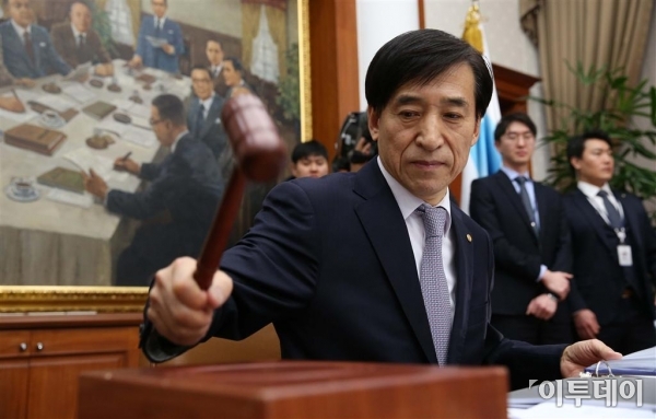 이주열 한국은행 총재가 14일 서울 남대문로 한국은행에서 열린 금융통화위원회에 참석해 의사봉을 두드리고 있다. 신태현 기자 holjjak@