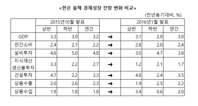 한은은 14일 발표한 '2016년 경제전망'을 통해 올해 국내총생산(GDP) 성장률을 3.0%로 추산했다. 이는 지난해 10월 발표했던 3.2%보다 0.2%포인트 낮춘 것이다. 올해 상반기와 하반기 GDP 성장률 수치도 3.3%→3.1%, 3.0%→2.9%로 각각 내렸다.