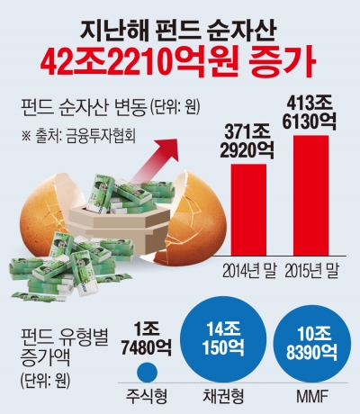 금융투자협회는 15일 2014년 말 국내 전체 펀드의 순자산을 413조6000억원으로 집계했습니다. 이는 전년보다 42조2000억원 증가한 수치입니다.