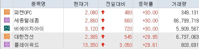 이 밖에 파캔OPC가 전 거래일 대비 30%(480원) 오른 2080원에 거래를 마쳤고, 비에이치아이는 전 거래일 대비 30%(720원) 오른 3120원에 상한가를 기록했다.
