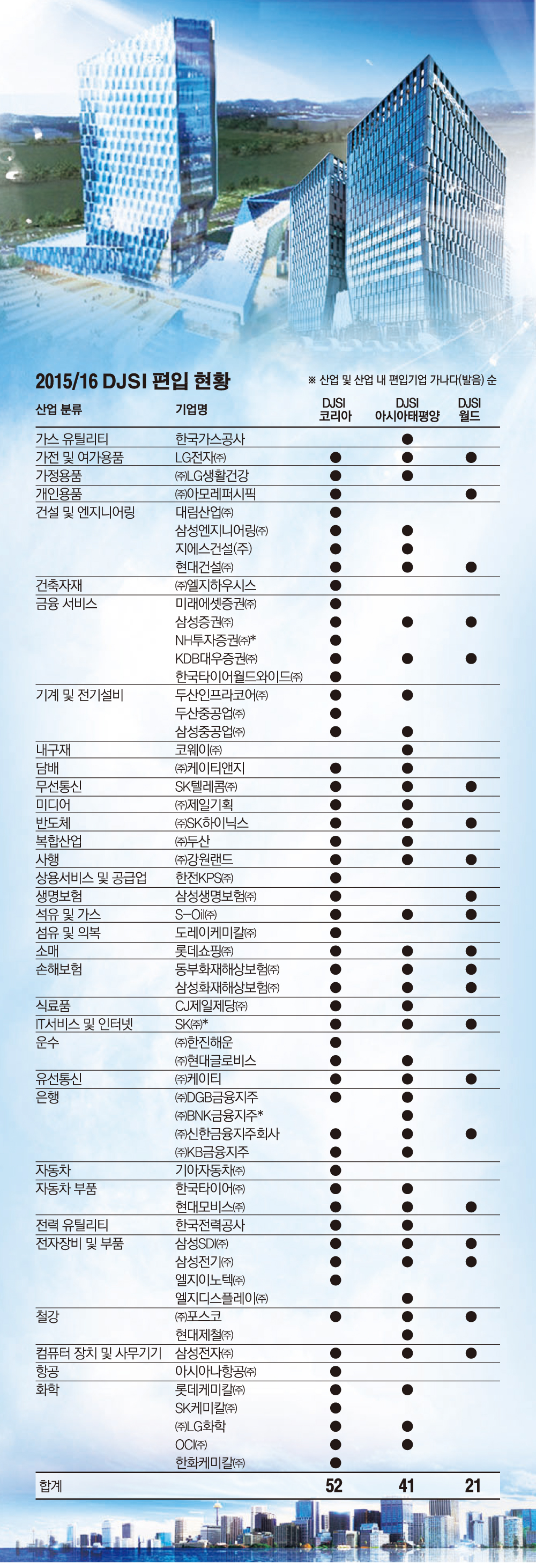 세계 최초의 국가단위 DJSI인 DJSI 코리아(한국)의 경우 평가대상 국내기업 200곳 중 52개 기업이 선정됐다. 이번 DJSI 코리아에 새로 편입한 기업은 삼성SDI, CJ제일제당, LG하우시스, GS건설, 한국전력공사, 현대글로비스 등 6개사이다. 올해 제외된 기업은 농심, 다음카카오, ㈜LG, KCC, 한국가스공사, 현대해상, 현대제철 등 7곳이다.