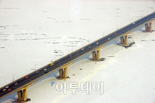 기록적인 한파가 물러나고 평년기온을 회복한 26일 오후 여의도 일대에 얼어버린 한강위로 하얀 눈이 쌓여있다. 노진환 기자 myfixer@