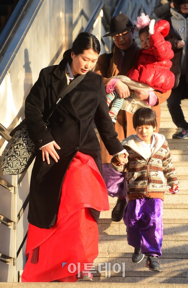 민족 최대의 명절 설 연휴가 시작된 5일 오전 서울역에서 한복을 입은 한 가족이 고향으로 향하는 기차를 타기위해 계단을 내려가고 있다. 노진환 기자 myfixer@