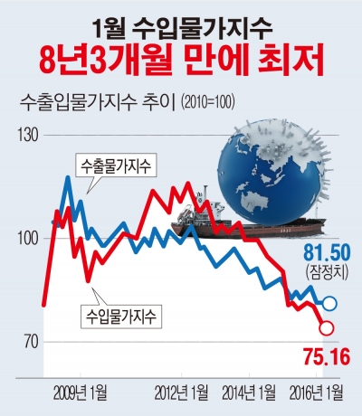 한국은행이 15일 발표한 ‘2016년 1월 수출입물가지수’를 보면 지난달 수입물가지수 잠정치는 75.16(2010년 100을 기준)으로 전월(76.16)보다 1.3% 하락했습니다. 이는 2007년 10월(74.86) 이후 8년 3개월 만에 가장 낮은 수준으로, 작년 7월부터 7개월 연속 하락세입니다.
