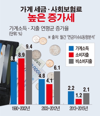 경제 여건이 좋지 않아 가계가 소비지출을 줄이는 가운데서도 조세와 국민연금·건강보험 등 사회보험료는 상대적으로 높은 증가세를 나타냈습니다.