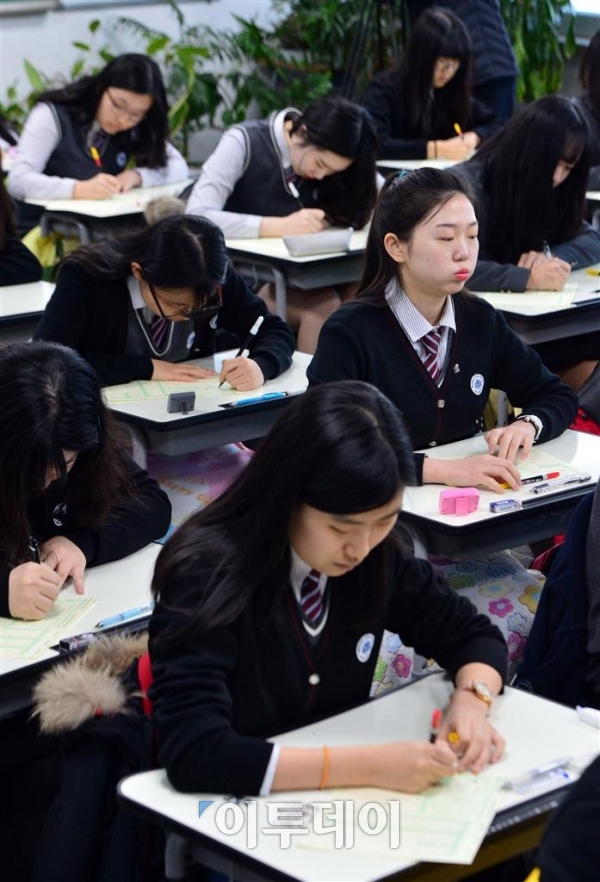 달라진 대학수학능력시험을 적용한 올해 첫 전국연합학력평가가 치러진 10일 서울 홍은동 명지고에서 학생들이 시험 문제를 풀고 있다. 서울시교육청이 주관, 전국 1887개 학교에서 128만 명이 시험에 응시한 이번 학력평가는 2017학년도 대학 수능시험체제에 맞춰 국어는 수준별 시험 대신 공통유형으로 출제됐으며 한국사가 필수과목으로 지정됐다. 신태현 기자 holjjak@