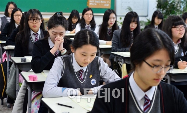 달라진 대학수학능력시험을 적용한 올해 첫 전국연합학력평가가 치러진 10일 서울 홍은동 명지고에서 학생들이 시험 시작 전 긴장을 풀고 있다. 신태현 기자 holjjak@