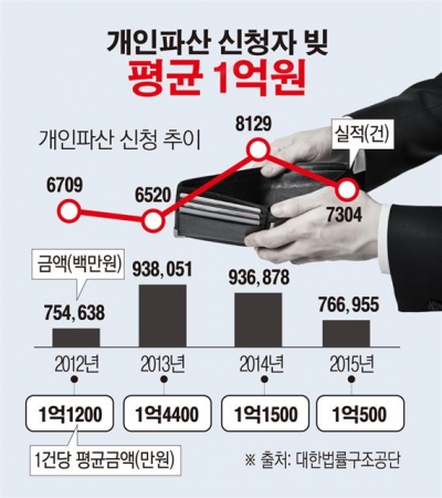 15일 공단에 따르면 지난해 개인파산을 신청한 사람들의 평균 부채액은 1억500만원이다. 2013년 1억4400만원으로 정점을 찍은 평균 부채액은 지난해 1억500만원으로 감소했다.