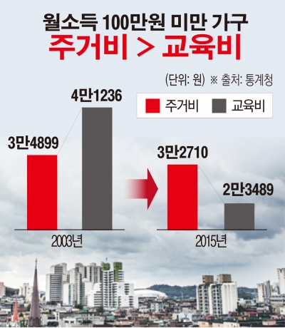 통계청의 소득구간별 가구당 가계수지에 따르면 지난해 월 소득 100만원 미만 가구의 주거비와 교육비는 월 평균 각각 3만2710원, 2만3489원으로 조사됐습니다.
