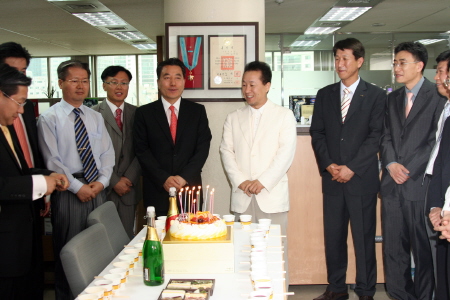 사진은 김포신도시 수주 후 심영섭 대표이사 부회장의 입회하에 자축연을 벌이고 있는 모습