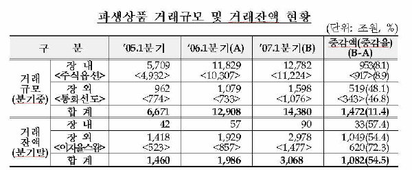 거래규모 기준으로 장내거래 증가율(8.1%)에 비해 장외거래 증가율(48.1%)이 크게 높아졌다. 이는 환율하락 위험 헤지를 위한 통화선도거래(장외거래)가 크게 증가했기 때문이다. 통화선도거래는 지난해 1분기 733조원 규모였으나 올 1분기에는 1076조원으로 전년 동기에 비해 46.8% 증가했다.