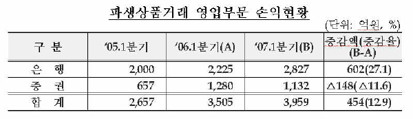 금융권역별로는 은행의 경우 전년 동기대비 602억원(27.0%) 증가한 2827억원을 기록했다. 증권은 1132억원의 이익을 얻었으나 전년 동기에 비해서는 148억원(-11.6%) 감소했다. 증권사의 파생상품관련 이익이 감소한 것은 외국증권사의 이자율 및 통화관련 파생상품이익이 전년 동기대비 171억원(71.2%) 감소한데 기인한다.