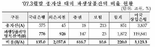 총자산 규모를 감안한 국내 금융회사의 파생상품 보유 규모(총자산대비 파생상품잔액 비율)도 3월말 현재 220.0%로 미국 상업은행의 3123.3%에 비해 크게 낮은 수준이다.