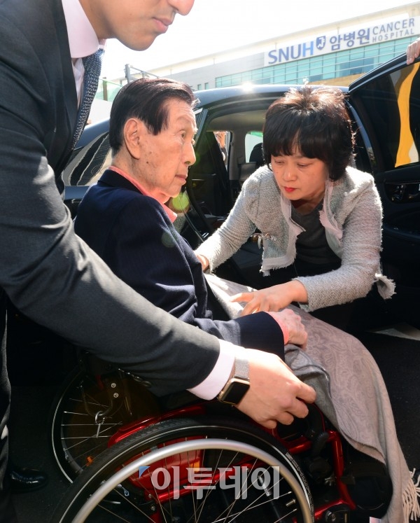 신격호 롯데그룹 회장이 16일 오후 정신감정을 위해 서울 종로구 서울대학교 병원에 도착해 관계자들의 부축을 받으며 휠체어에 앉고 있다. 2016.05.16. 이투데이 노진환