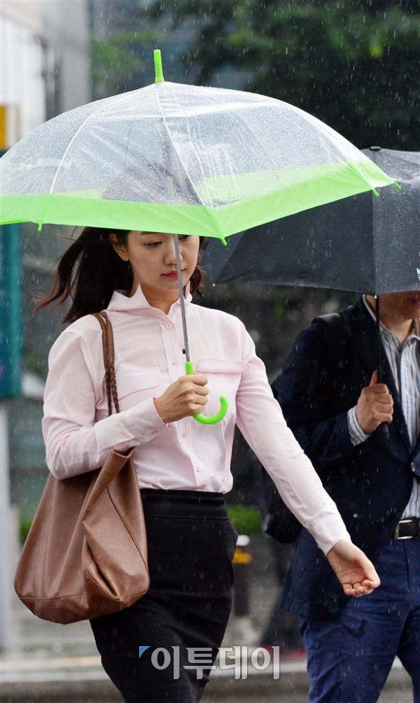 더위를 식히는 비가 전국적으로 내린 24일 오전 서울 세종로 광화문 사거리에서 시민들이 우산을 쓴채 출근길을 재촉하고 있다. 신태현 기자 holjjak@