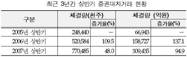 올해 상반기 주식을 빌려 거래하는 대차거래 규모가 30조원을 넘어서서 전년동기 대비 두 배 가까이 증가한 것으로 조사됐다.