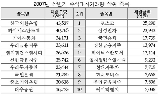 올 상반기 체결금액 기준으로 대차거래규모가 큰 종목은 ▲포스코(2조5290억원) ▲삼성전자(2조3943억원) ▲국민은행(1조7739억원) ▲신한금융지주(1조3974억원) ▲하이닉스(1조3114억원) ▲LG필립스LCD(9232억원) 순으로 많았다.