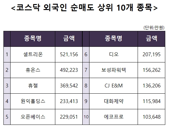 7일 코스닥 외국인 순매도 상위 10개 종목